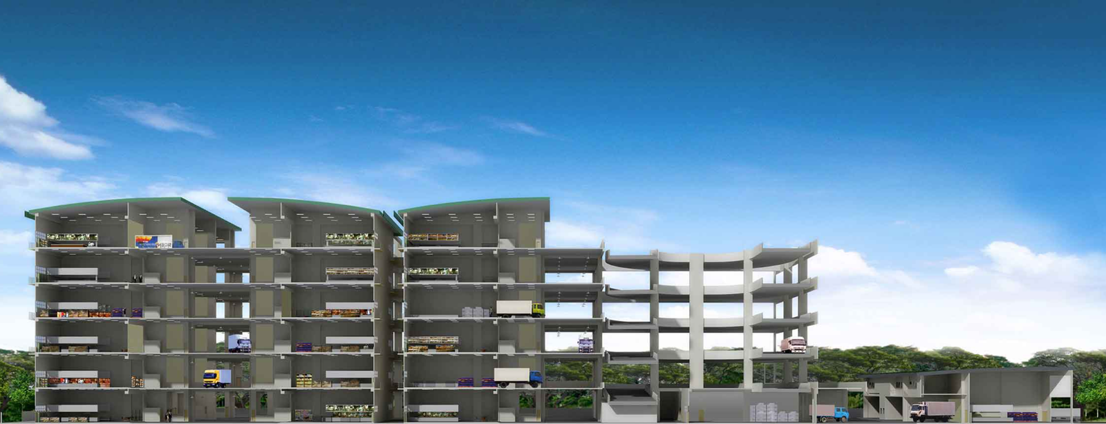 The building is a six‑storey ramp‑up facility, offering significant time savings. Twenty‑footer containers can be driven directly to the unit door on any level, eliminating competition for cargo lifts and the need to wait at ground‑floor loading bays—a major advantage for high‑volume distribution or catering operations with tight delivery windows.